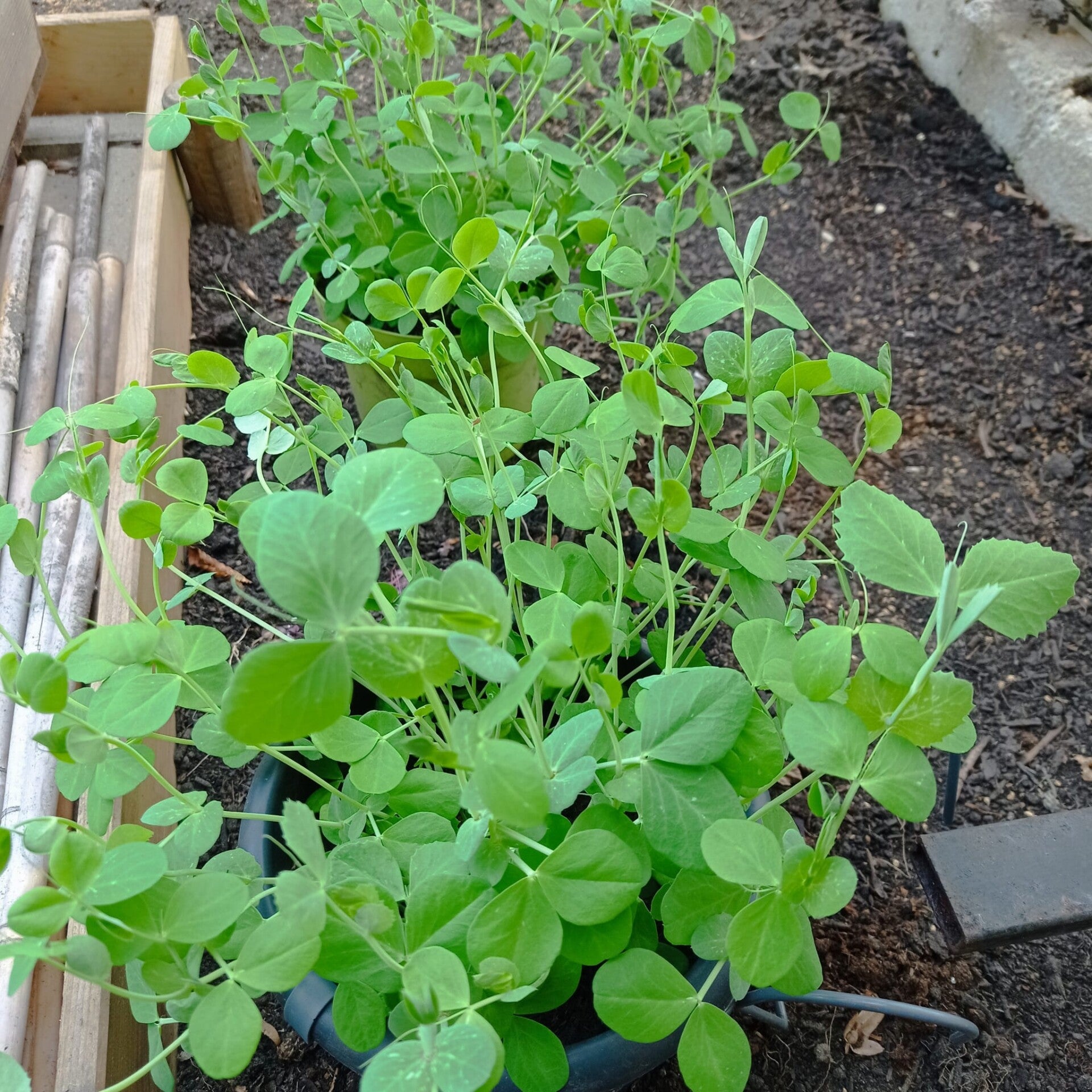De erwtenscheuten kunnen geoogst worden, dit jaar heb ik het ras zonder hechtranken geplant.