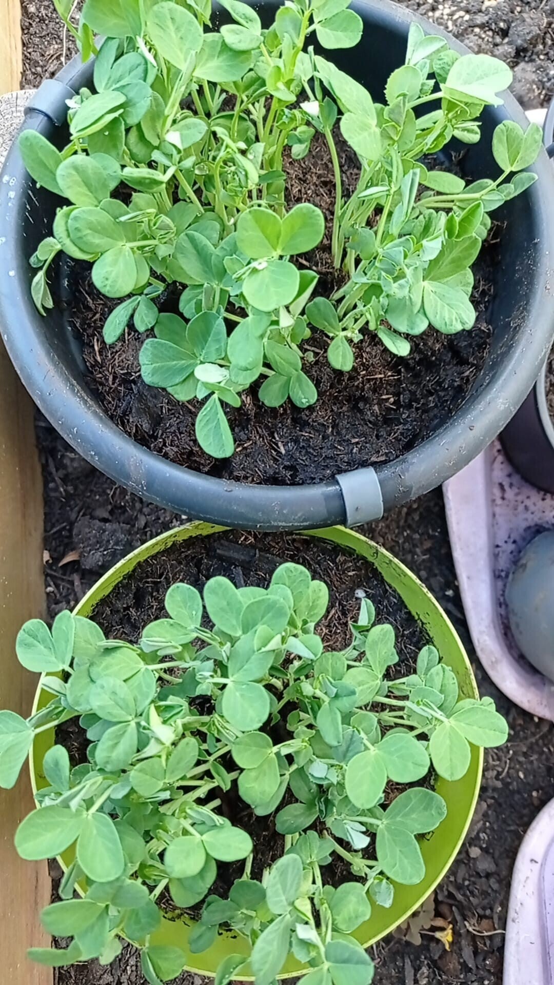 De erwtenscheuten kunnen geoogst worden, dit jaar heb ik het ras zonder hechtranken geplant.